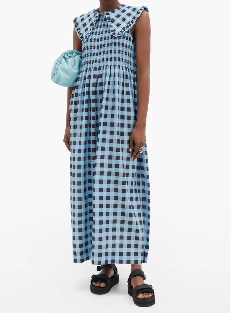 GANNI Ruffled collar blue check cotton / silk blend dress - EUR 38 (size 10 )