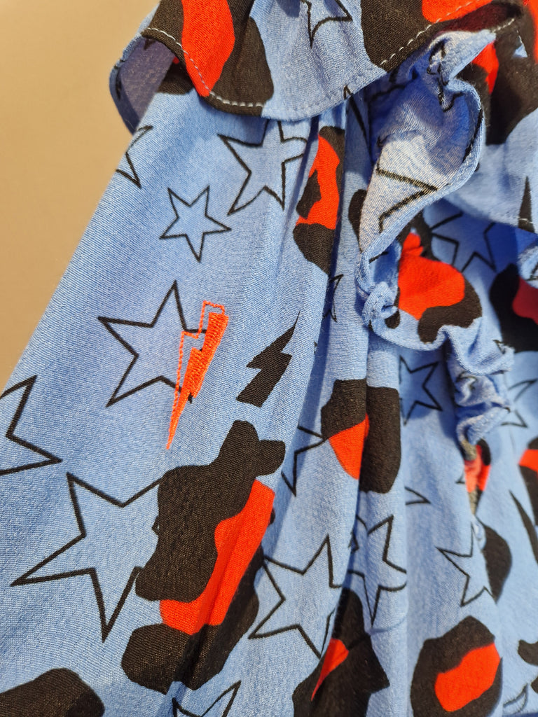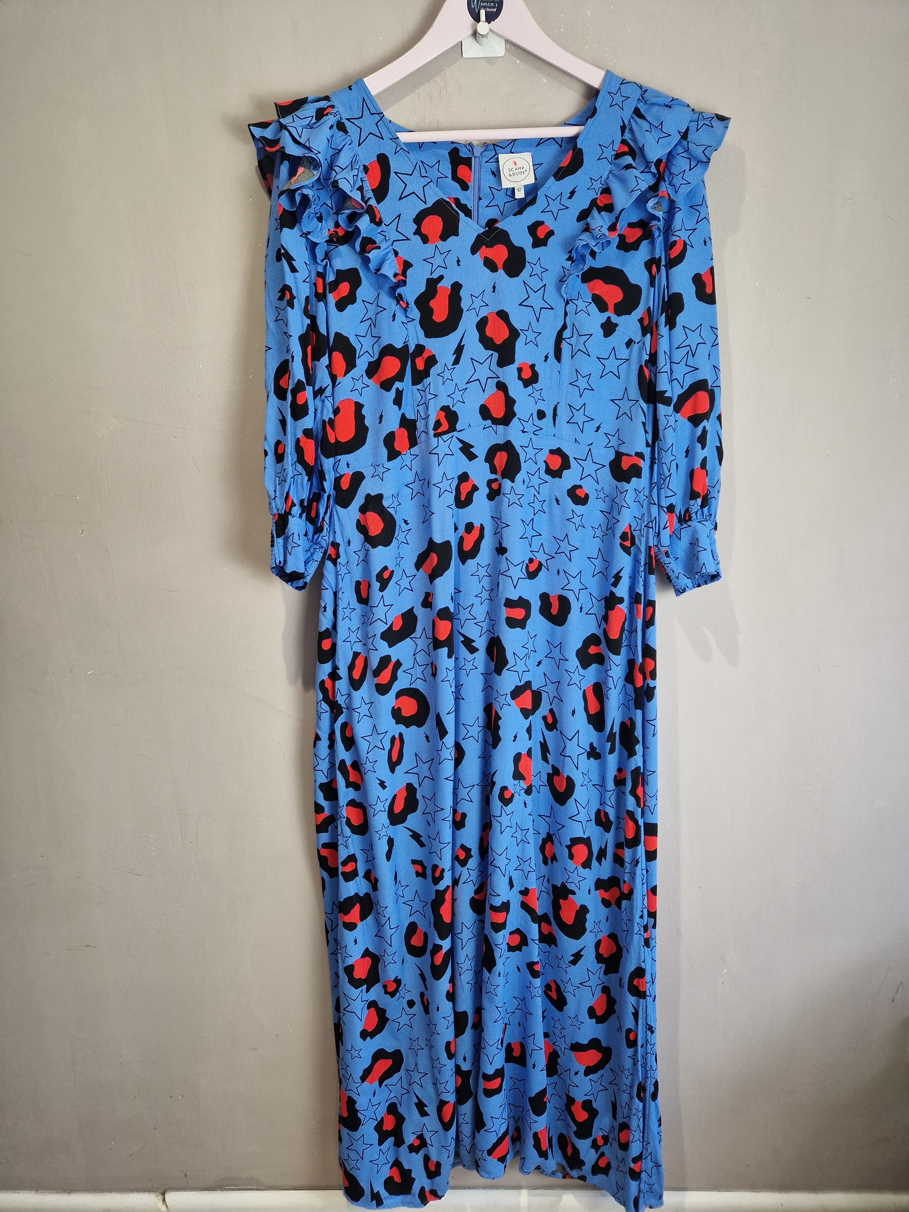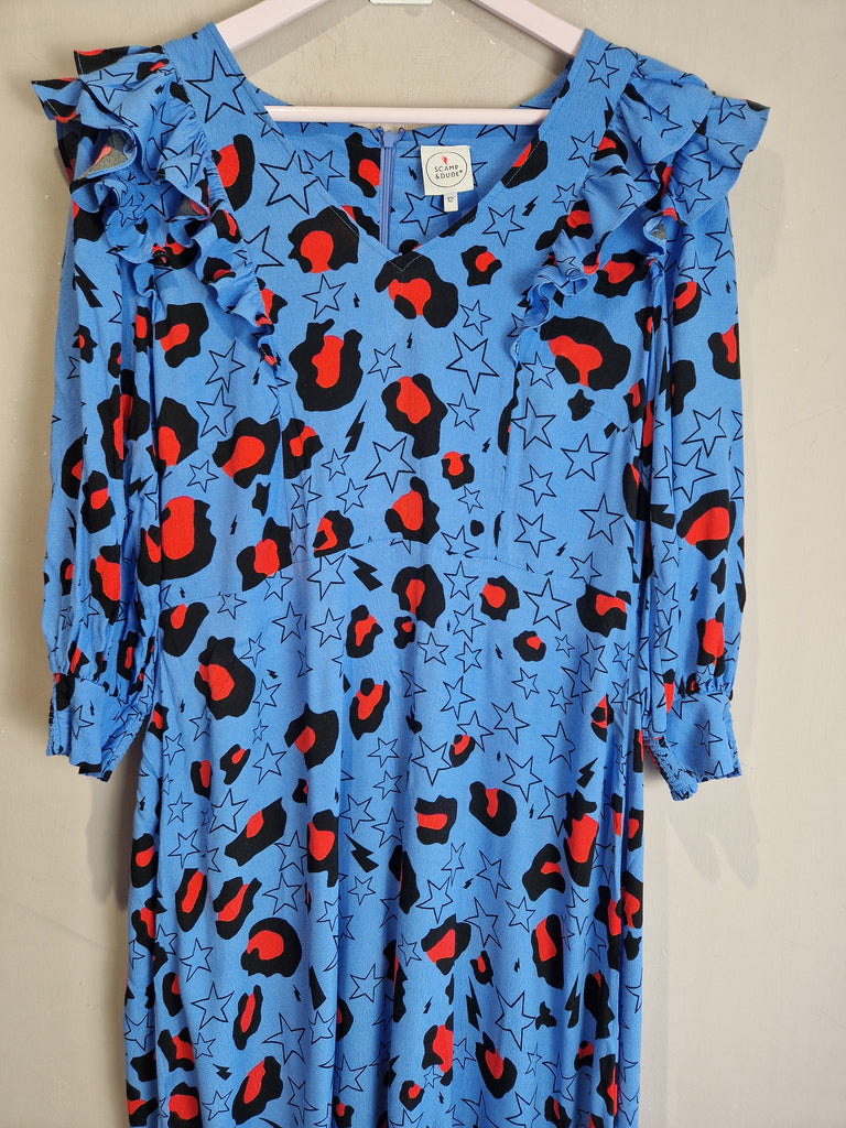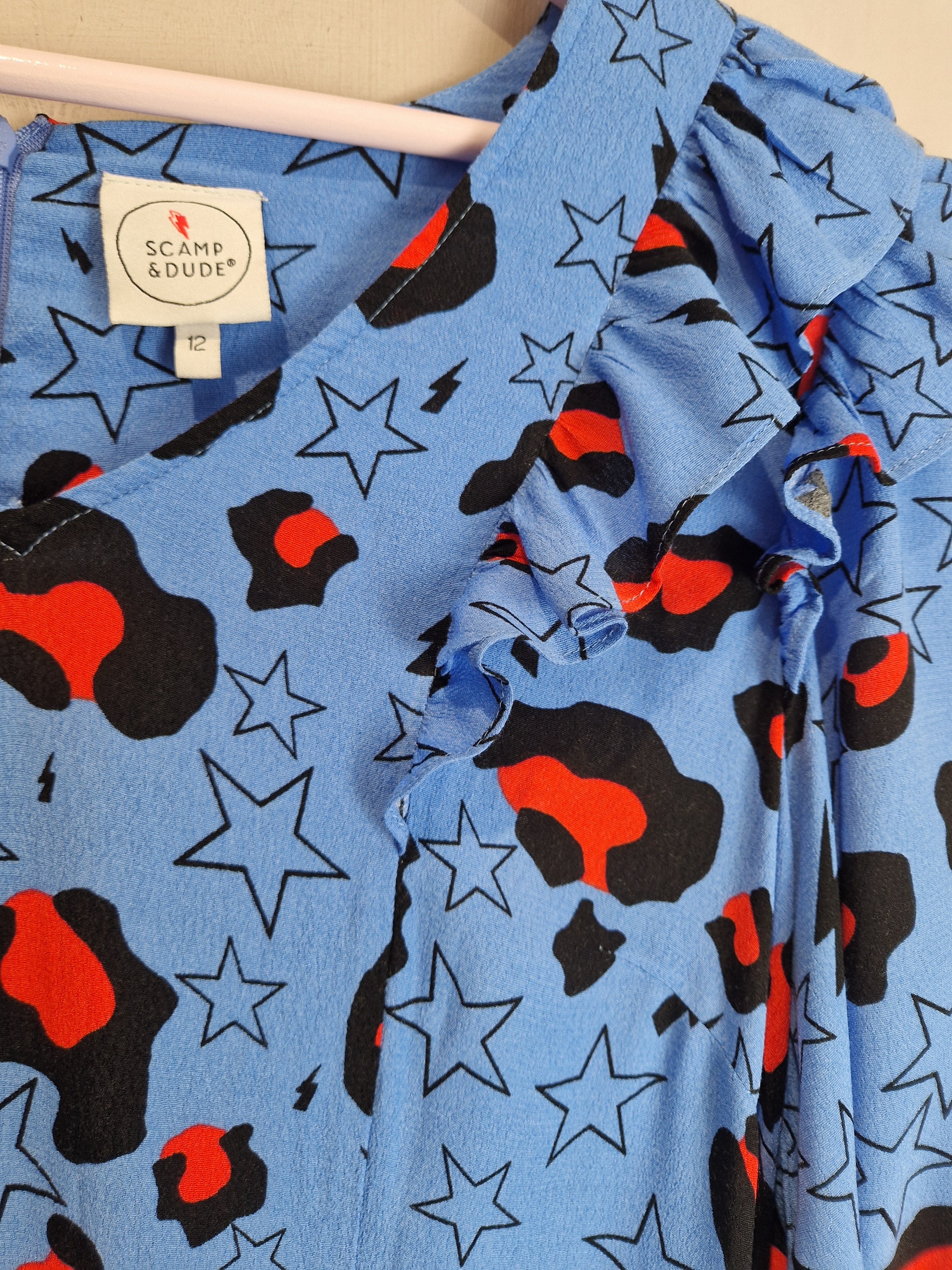 Scamp & Dude blue leopard and star frill dress - size 12 is backordered and will ship as soon as it is back in stock.