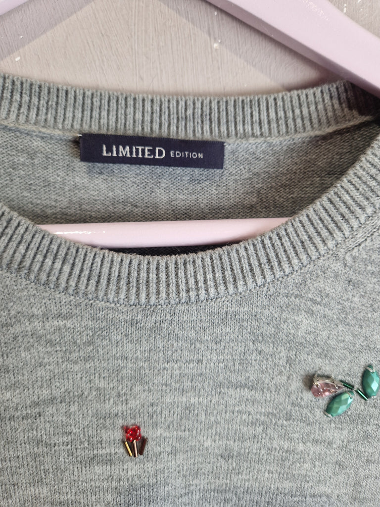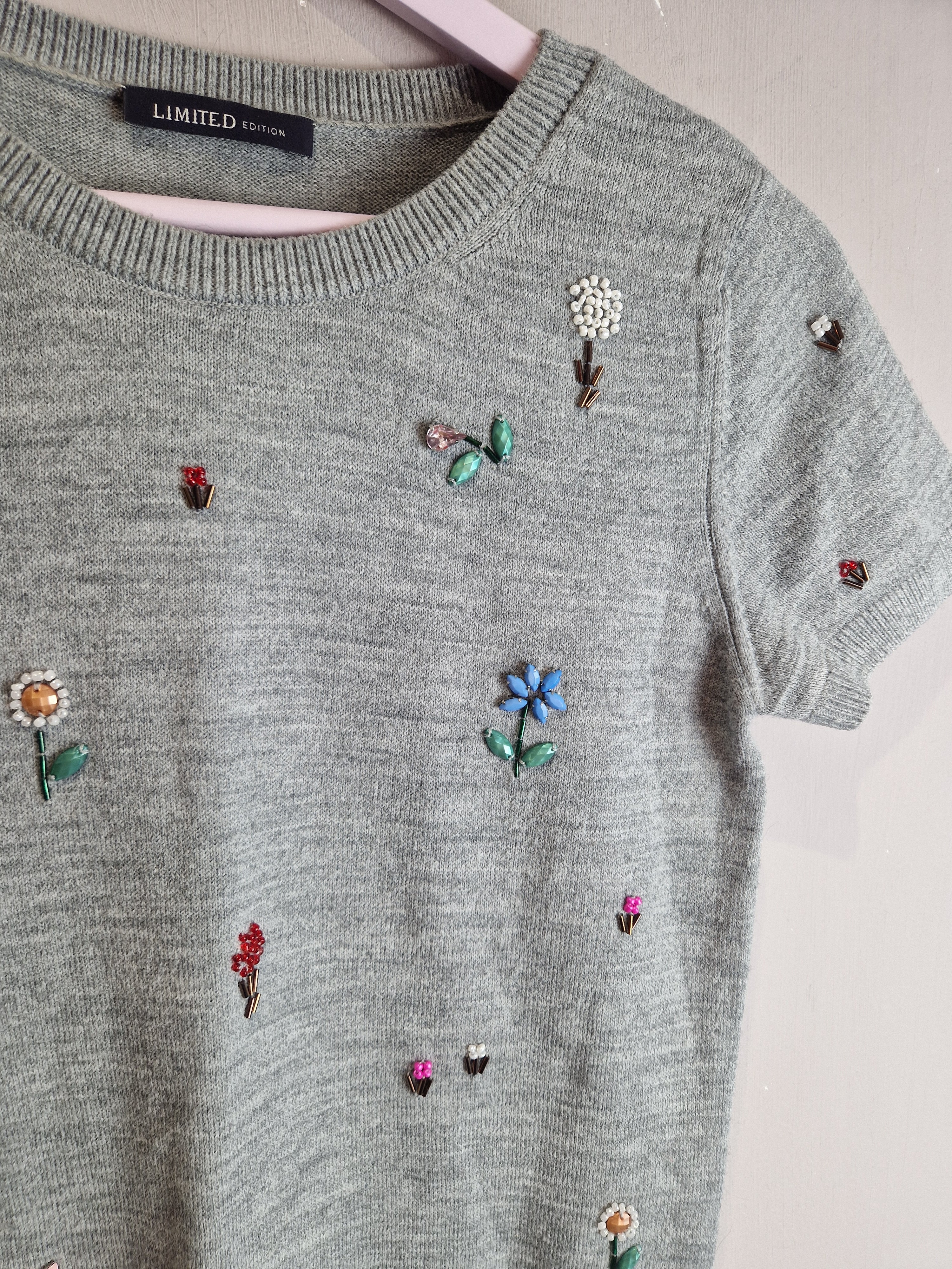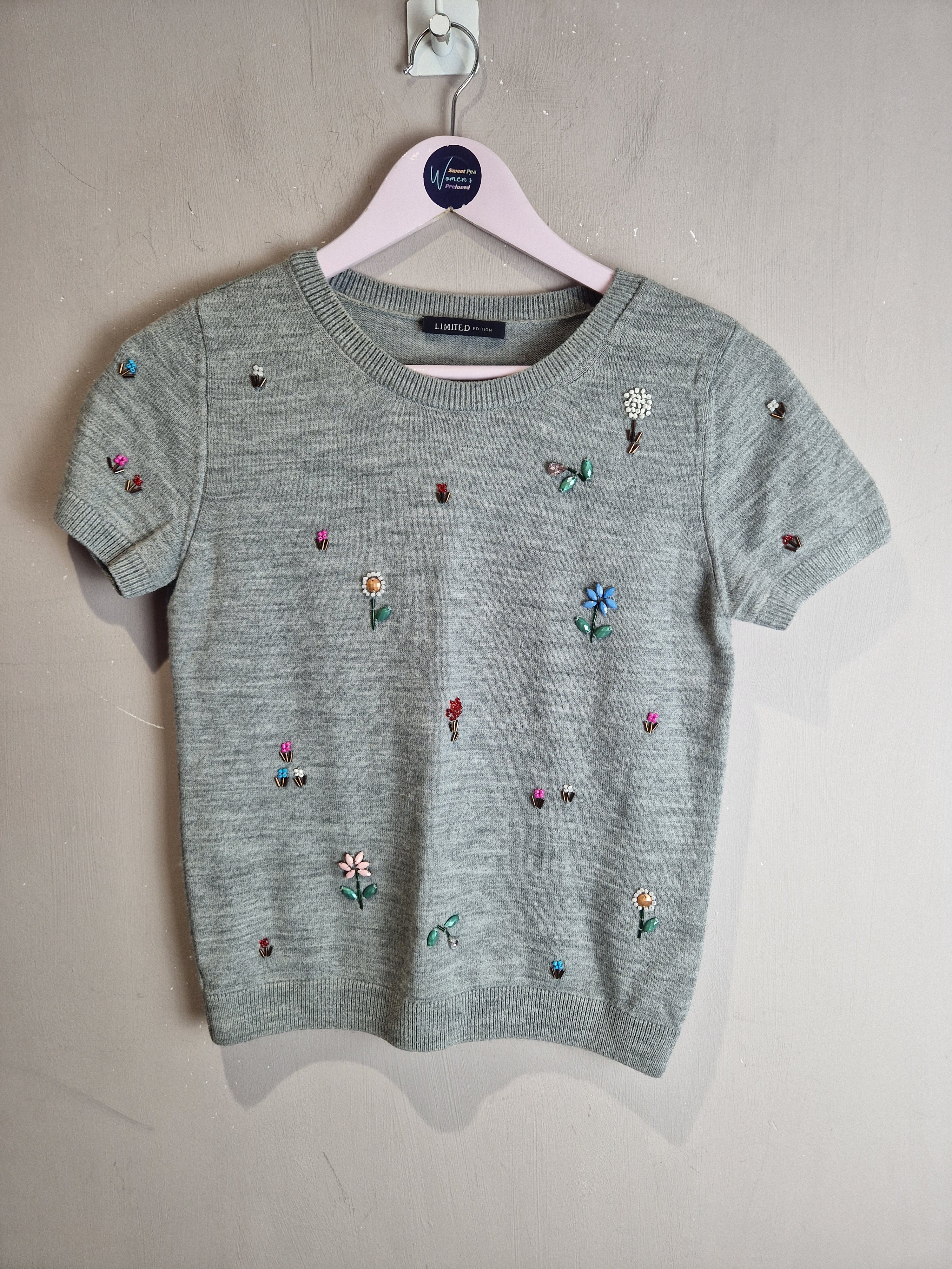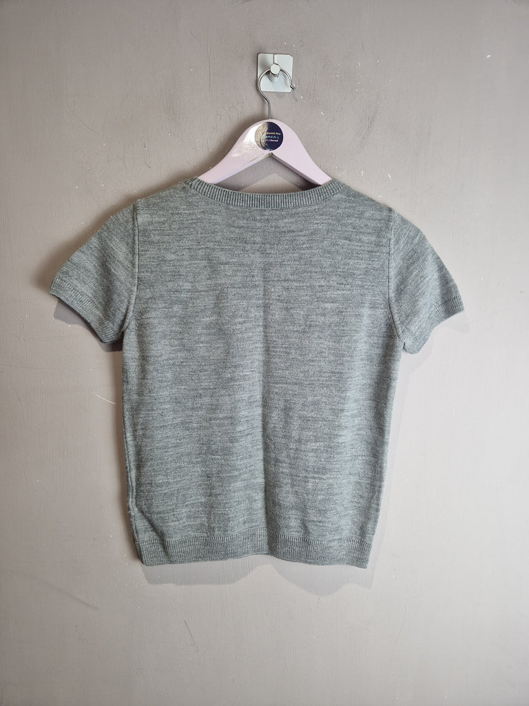 M&S grey short sleeve embellished knit - size 8 is backordered and will ship as soon as it is back in stock.